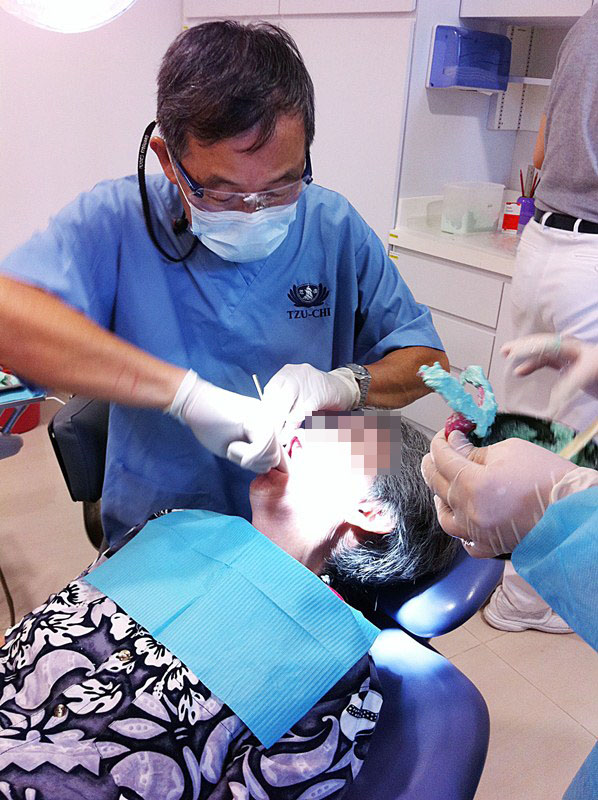 Volunteers brought Madam Hu to the Free Health Screening and Medical Clinic for a body checkup. TIMA’s Dr. Ong Chin Kian also took a dental mold from Madam Hu so that she could be fitted with dentures. (Photo by Phay Ley Leng)