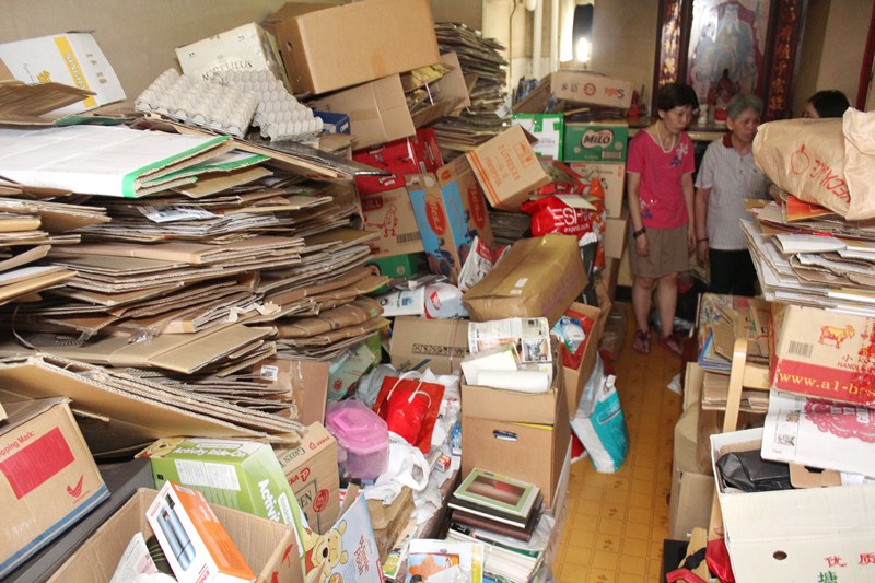 Not having much knowledge of recycling, Madam Hu’s daughter, Mei Hua, brought home junk items alongside the recyclable ones and cluttered up the hall. Eventually, only a narrow pathway was left for walking. (Photo by Lee Foo Tien)