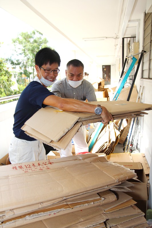 Watching how much effort the volunteers put into sprucing up his home, Madam Hu’s son, Guang Jun, was moved to help volunteers transport the discarded items downstairs. (Photo by Lee Foo Tien)