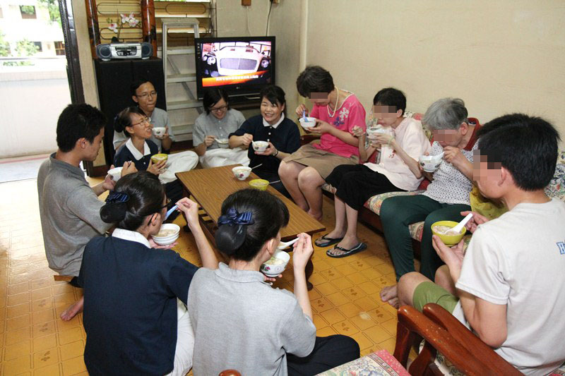 After a half day’s hard work cleaning the flat, everyone sits down to enjoy a bowl of glutinuous peanut dumpling soup prepared by volunteers. (Photo by Lee Foo Tien)