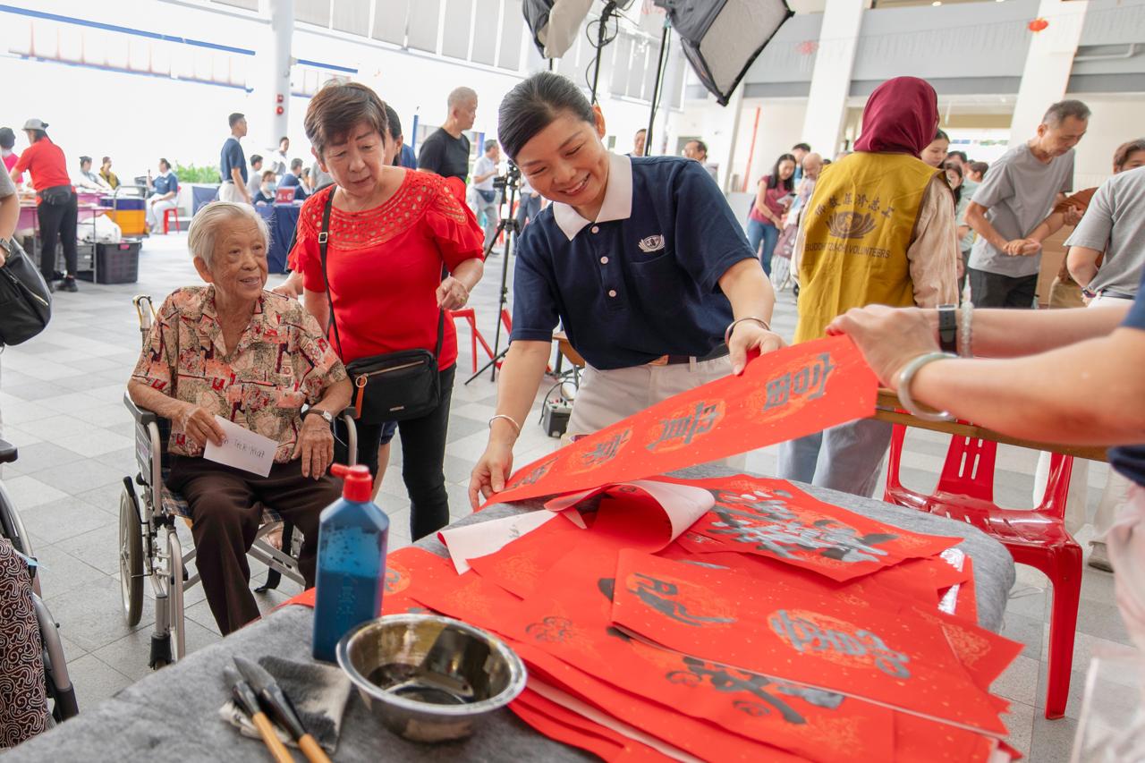 Calligrapher Eliza Zhu, originally from Shanghai and residing in Singapore for over thirty years, was invited by volunteers to write couplets on-site. She had prepared many works related to the Year of the Horse and customised couplets according to the needs of care recipients.