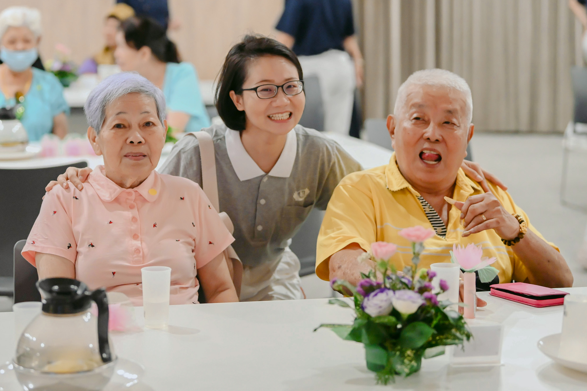 Chua Chee Hin (right) and Lim Ah Bee (left) were very happy to participate in the Renal Friends Tea Gathering in the company of volunteers. (Photo by Chai Yu Leong)