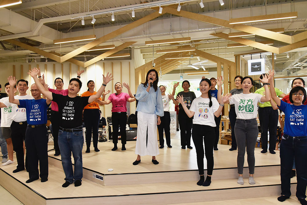 "Guarding one’s mouth is the hardest thing to do in life. Changing one’s habits is never easy either. However, if your vow is sincere, you will find the strength to do it!” are part of the lyrics of the song Lin Meijiao and the volunteers are singing. (Photo by Goh Shoo Weng)