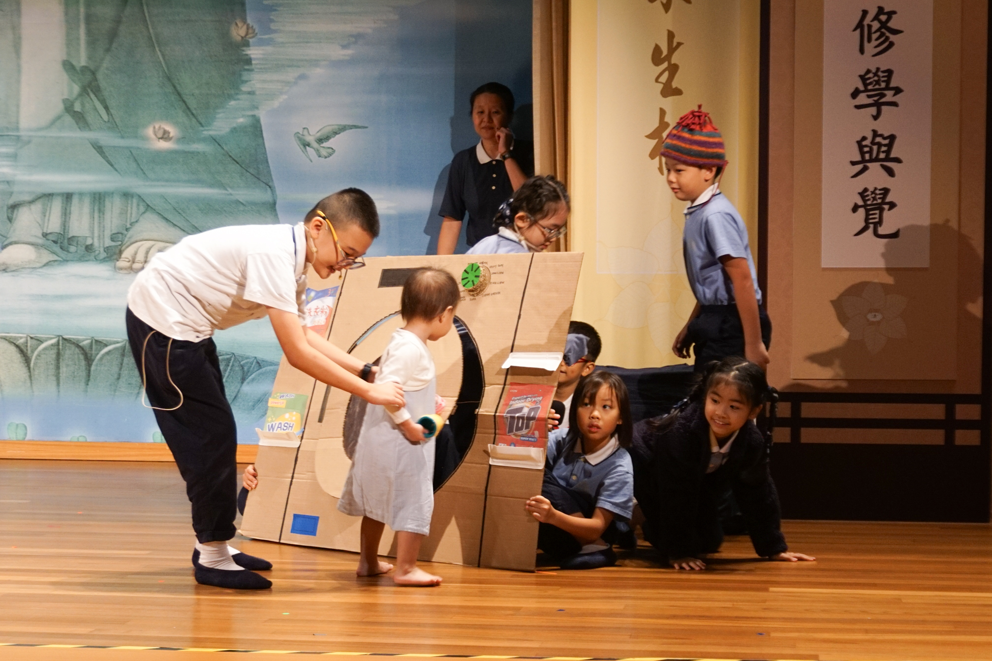The actor playing Ding Ding is nine-year-old Wan Jun Kai, who gave himself an eight out of ten for his performance on this day. He shared that preparing for the short play wasn't difficult, but it required multiple rehearsals. Wan Jun Kai graduated from the Tzu Chi Great Love Preschool. He is a sensible boy who cherishes resources and helps his parents with housework. He also puts into practice the environmental protection and conservation ideas he learned in class at home.