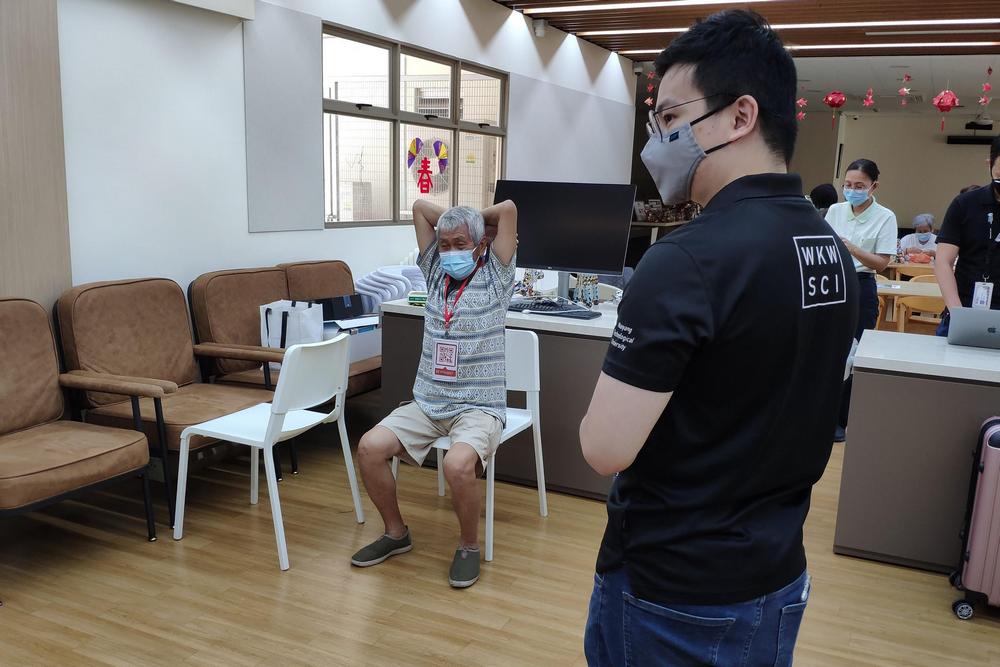 An NTU researcher guiding a senior through the VR training system. (Photo by Wong Yen Hoon)