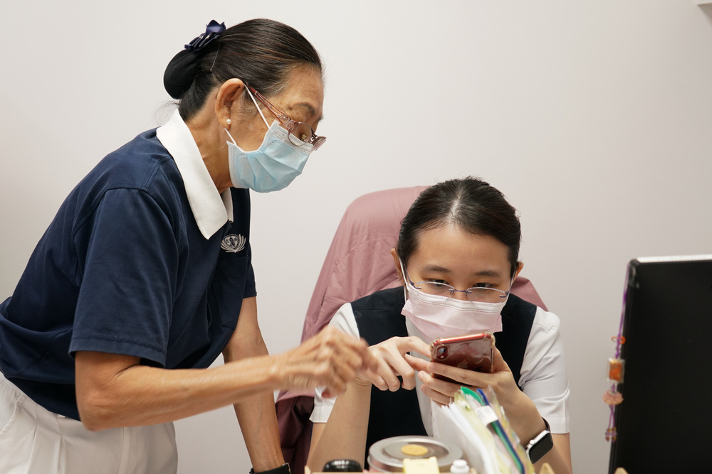 Ever the willing learner, Mdm Koo (left) would consult clinic staff Aveline Tan Zhen Hui (right) whenever she faced any technological-related issues. (Photo by Chan May Ching)