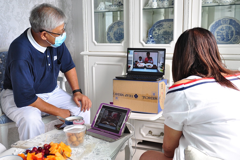 The virtual programme was informative and interesting. A volunteer and Madam Wu (right) watched on attentively and talked about their everyday life. (Photo by Kwek Kar Chiew)