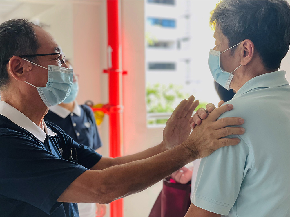Home visit volunteer Willy Ang (left) gently tap onto Mr Wong’s (right) shoulder as a gesture of support, while Mr Wong acknowledges it with his right hand. Without the need for words, the exchange of gestures demonstrated the comradery between two adults – a sense of mutual help and encouragement. (Photo by Yang Wen Ting)