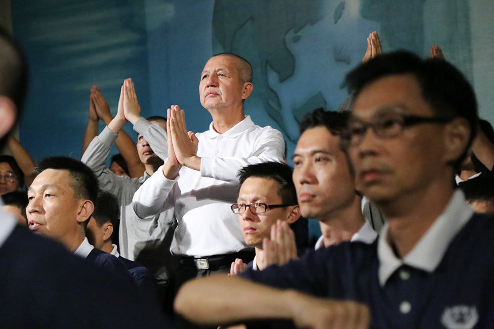 2014年,沈喜洲提供公司二楼的办公室作为举办薰法香和读书会的社区道场。他本人也经常把握因缘和志工分享法喜心得。(摄 / 黎东兴)