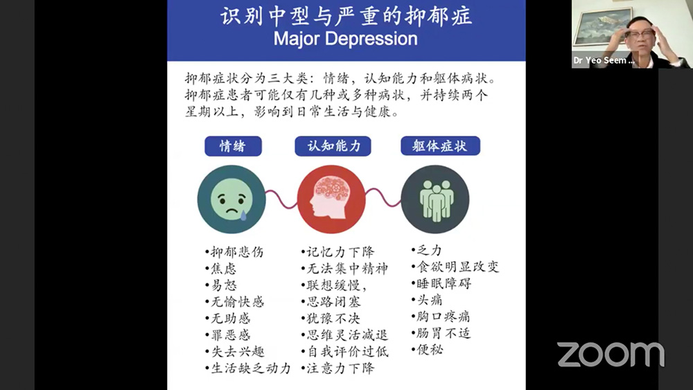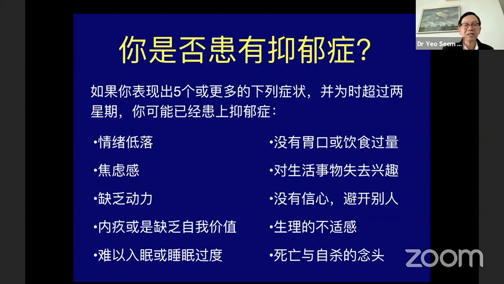 知名心理医师杨新发应新加坡慈济的邀请,主讲线上讲座《战胜抑郁,重見彩虹》。他提及抑郁症的“二不”——抑郁症不是无病呻吟,不是单纯的思想问题或心理困扰。更不是安慰当事人“想开一点”那么简单;抑郁症其实并不可怕,可怕的是我们对它不了解。