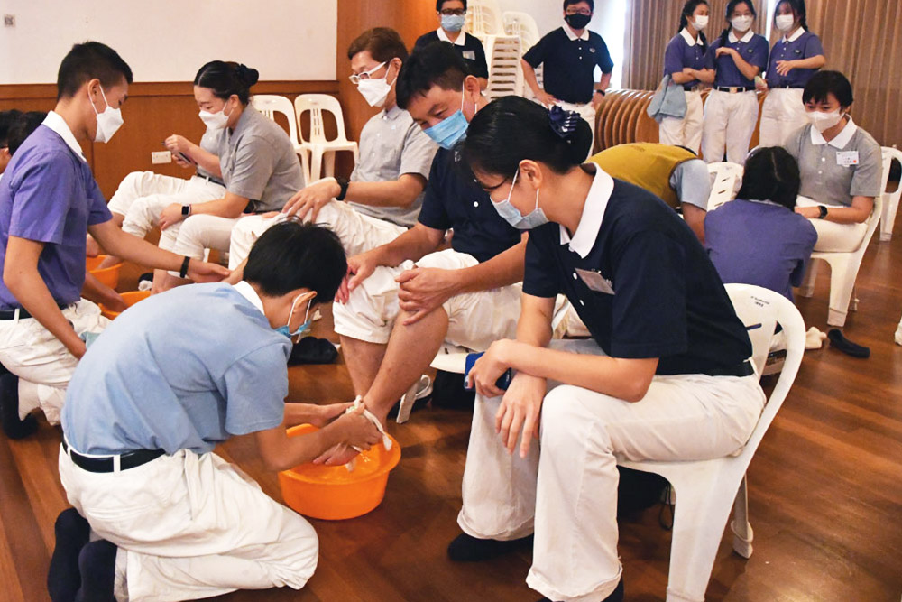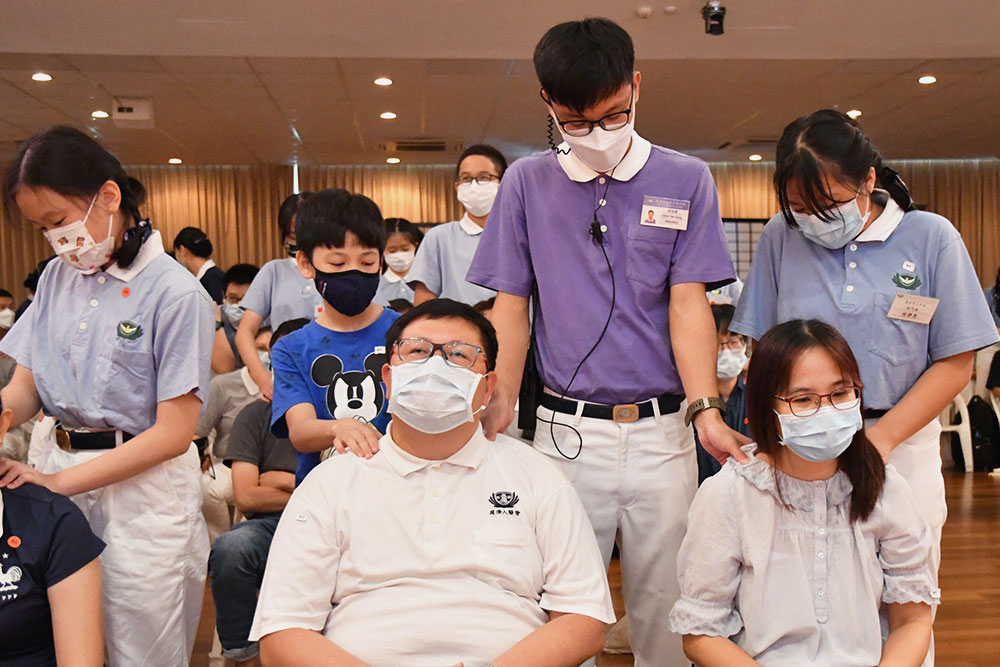 防疫限制下,今年虽然不能进行奉茶和喂食仪式,慈少班仍精心策划了浴足和解压按摩环节,让子女和父母能真心交流。
