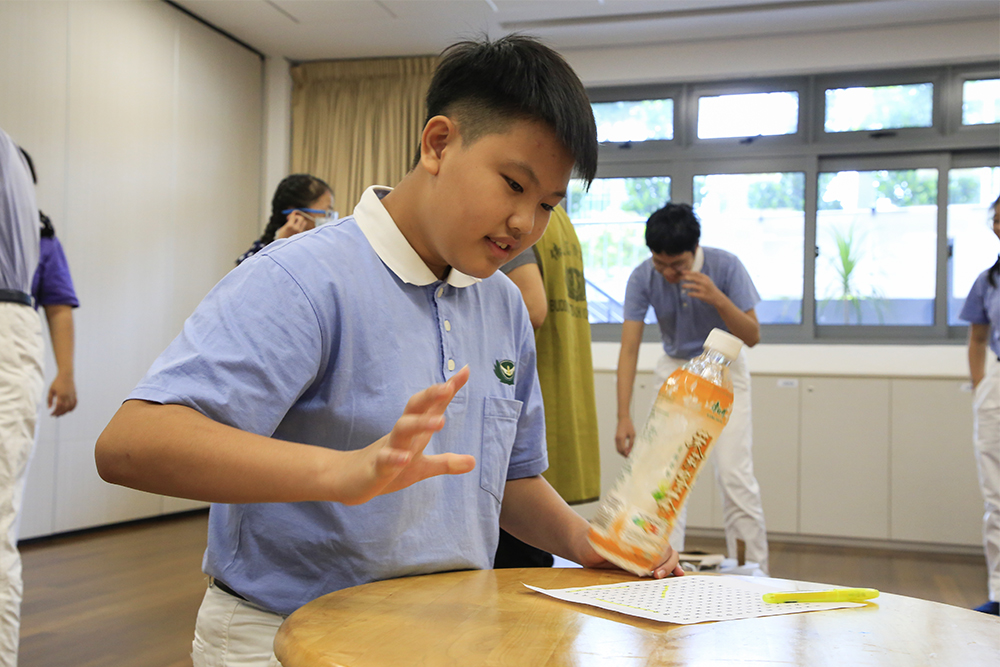 翻转宝特瓶,看似简单难度却高。游戏让彼此距离拉近,也学习互助与分享。(摄/ 冯桂琼)