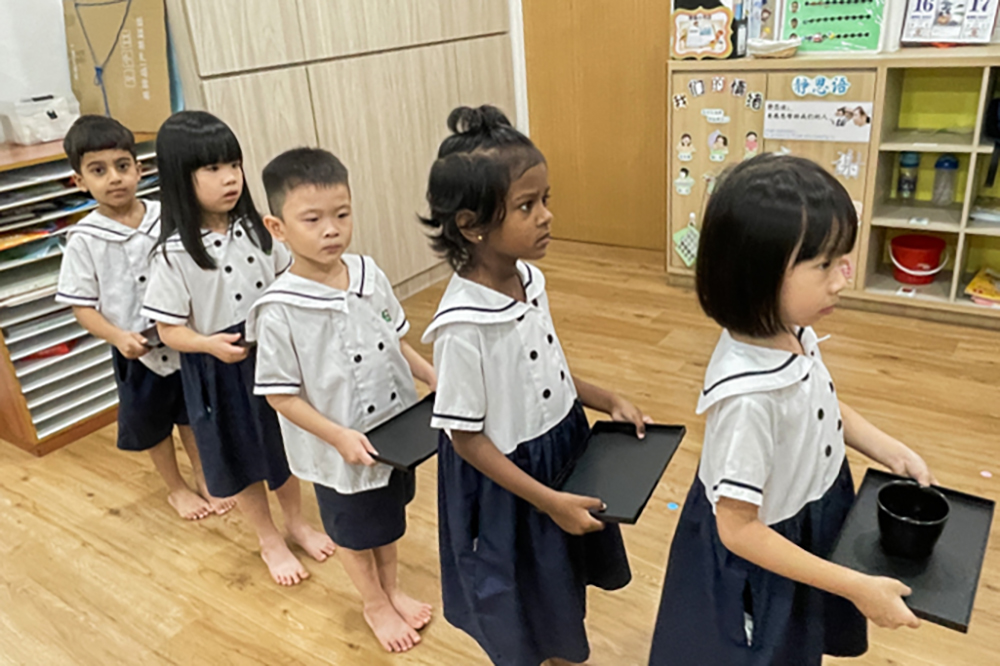 彩排练习时,课室不时传来孩子把杯子打翻在地的声音,老师频频需要拿抹布擦拭地板。今天看到孩子在多次练习后,独立而且顺利地完成奉茶,老师们都觉得很欣慰:“原来他们是可以做到的。”